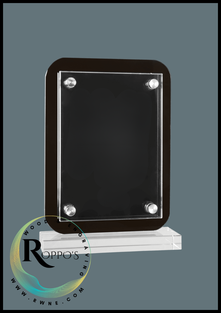 The Floating Glass Standup Plaque is 3/16″ thick, featuring a green-tinted beveled-edge glass suspended 1/4″ above with silver hardware, with an overall width of 1 7/8″. The plaque stands vertically with a felt-lined, clear base.