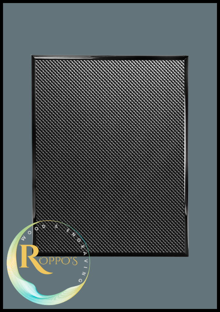 Piano Carbon Fiber Finish Plaques are unique! They come in multiple sizes. They are 3/4 inch thick and have a keyhole on 2 sides to hang horizontally or vertically. They are easily customizable by engraving or adding a plaque plate. Engraving results are light brown. This plaque comes with a felt-covered back and has a fiberwood core.